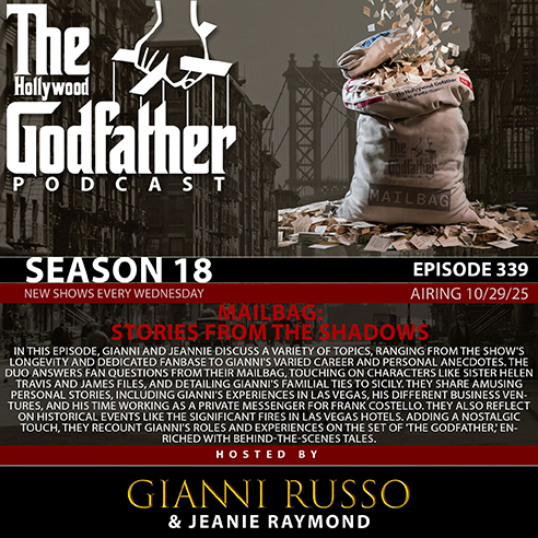 In this episode, Gianni and Jeannie discuss a variety of topics, ranging from the show’s longevity and dedicated fanbase to Gianni’s varied career and personal anecdotes. The duo answers fan questions from their mailbag, touching on characters like Sister Helen Travis and James Files, and detailing Gianni’s familial ties to Sicily. They share amusing personal stories, including Gianni’s experiences in Las Vegas, his different business ventures, and his time working as a private messenger for Frank Costello. They also reflect on historical events like the significant fires in Las Vegas hotels. Adding a nostalgic touch, they recount Gianni’s roles and experiences on the set of ‘The Godfather,’ enriched with behind-the-scenes tales.